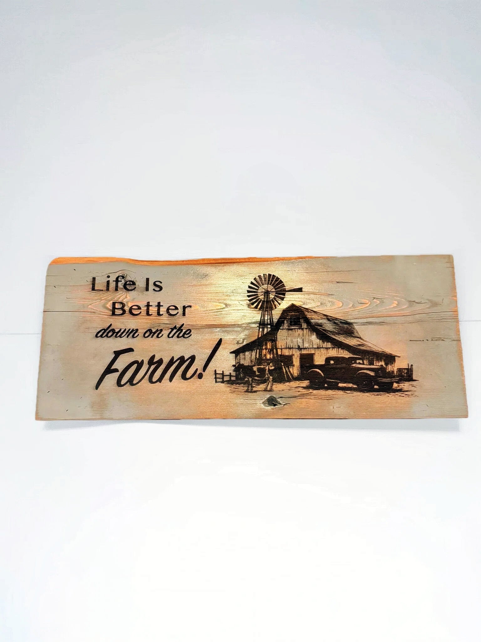 Handcrafted barn wood plaque featuring an engraved farm scene with the timeless phrase "Life is better on the Farm." This rustic piece celebrates agricultural heritage. The natural wood grain adds authentic character, making it an ideal accent for farmhouse décor, country kitchens, or anyone who cherishes rural traditions. A meaningful gift for farmers, homesteaders, or those who appreciate the peaceful simplicity of farm life.